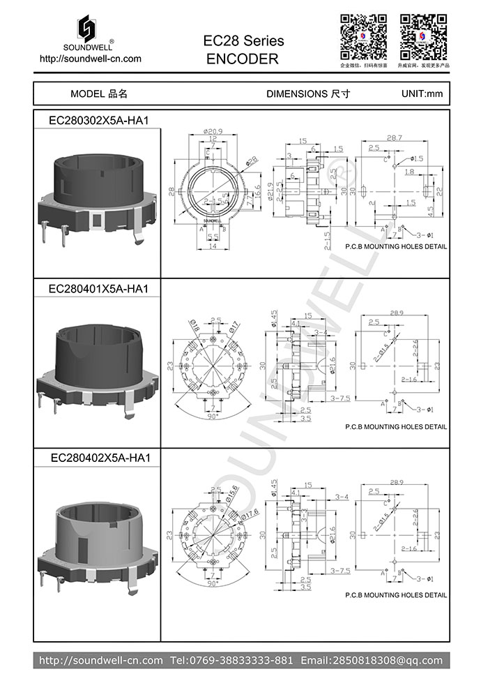 | Main Specifications: | Dimensions: ∮28mm Rated voltage: DC 10V; Number of detent: 18/30; pulses: 15/18; Working temperature: -40°C~85°C; Rotational life: 50,000 cycles Min |