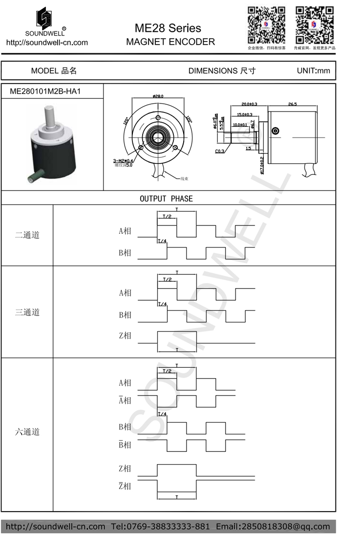 | 主要規格: | 外形尺寸:28mm 額定功率:5~26Vcc ,40mA; 響應時間:Max 1us 響應頻率:300KHz 輸出相位差:△T=0.25T±0.125T 工作溫度:-40℃~85℃; |